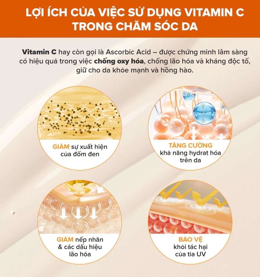 + 5% Vitamin C ổn định hỗ trợ làm sáng và cải thiện tông da, đồng thời chống oxy hóa, củng cố hàng rào bảo vệ trước ánh nắng mặt trời