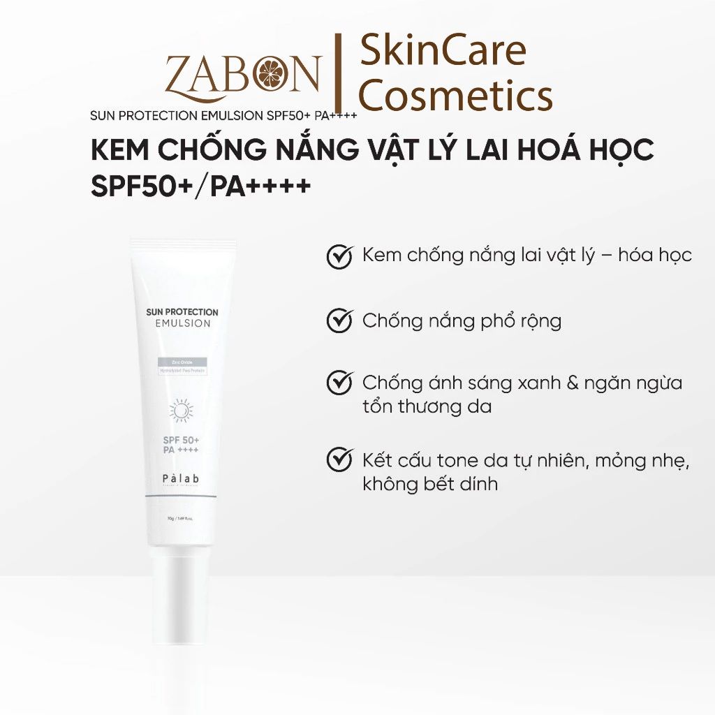PALAB Sun Protection Emulsion là kem chống nắng lai vật lý – hóa học. Sở hữu những ưu điểm từ kết cấu cũng như khả năng chống nắng từ hai loại dòng chống nắng phổ biến. Chống nắng phổ rộng, tạo màng phản xạ vật lý và màng lọc hóa học khỏi UVA UVB với chỉ số chống nắng cao SPF50/PA++++.