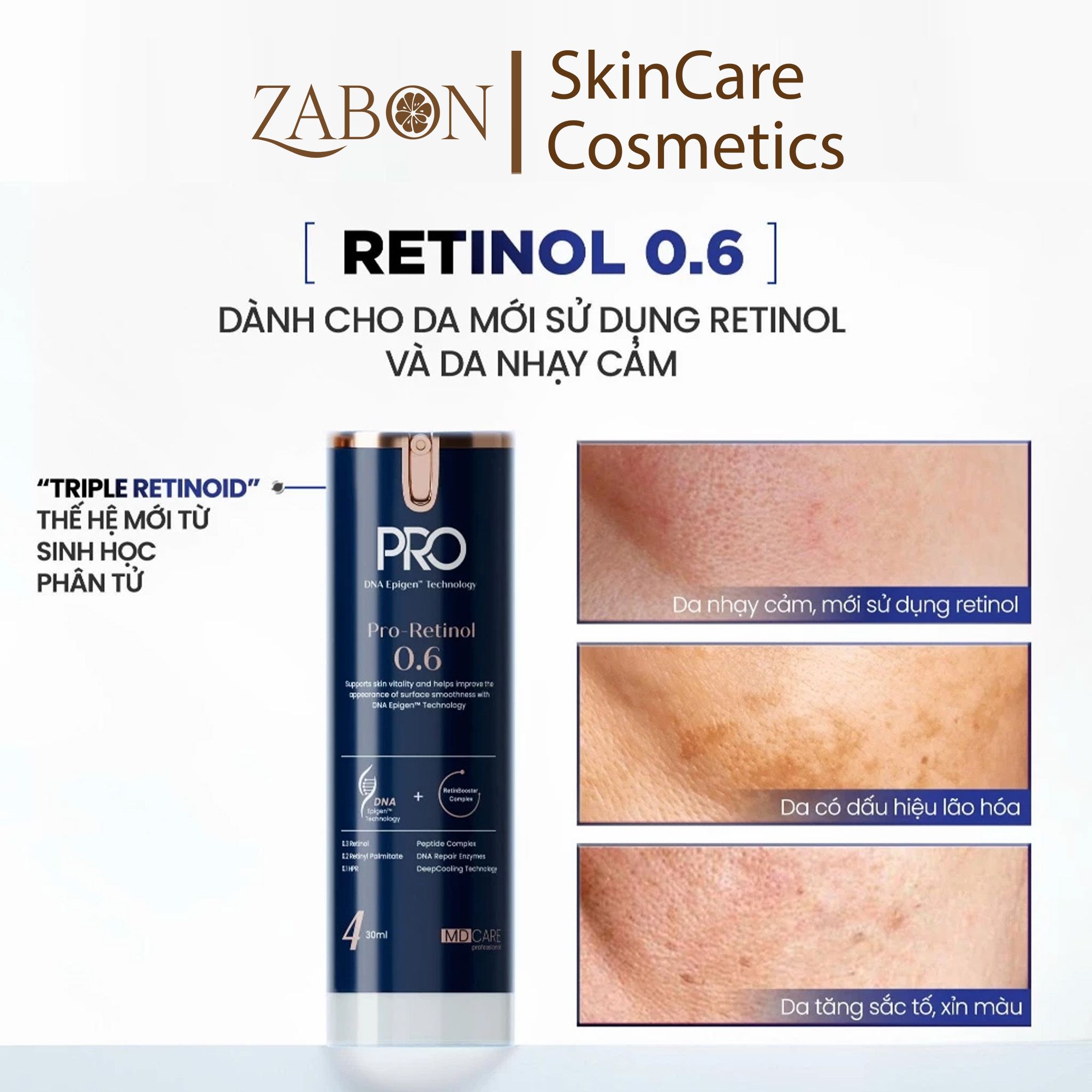 MD CARE PRO-RETINOL 0.6 30ml hỗ trợ làm sáng, giảm thâm mụn, mờ đốm nâu; cải thiện nếp nhăn & các dấu hiệu lão hóa. Nuôi dưỡng da mềm mại, đều màu.