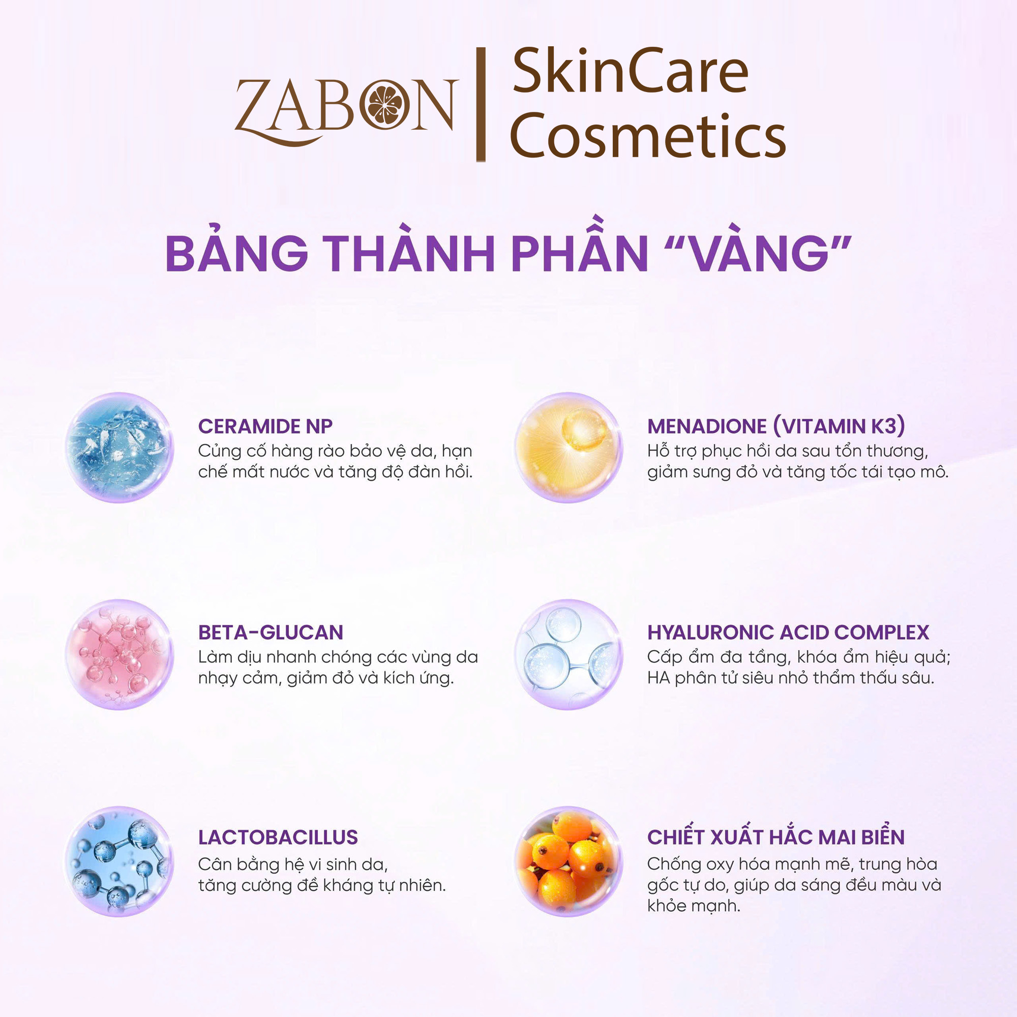 - Betaine : Tăng cường cấu trúc da, phục hồi hàng rào bảo vệ da tự nhiên. Phục hồi da, dưỡng ẩm, làm dịu da, tổn thương