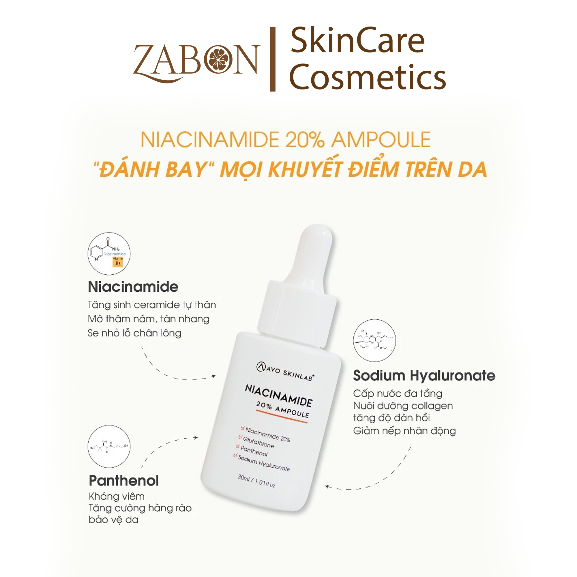 + Niacinamide : Tăng sinh ceramide tự thân, làm sáng da G làm mờ nám tàn nhang, thâm mụn. Đồng thời thu nhỏ lỗ chân lông