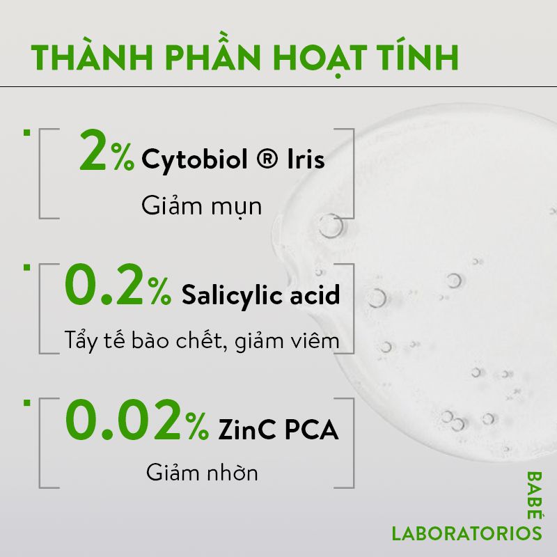 Iris extract – Chiết xuất Hoa Diên Vỹ: giảm viêm Zinc Sulfate: điều tiết bã nhờn, kháng viêm