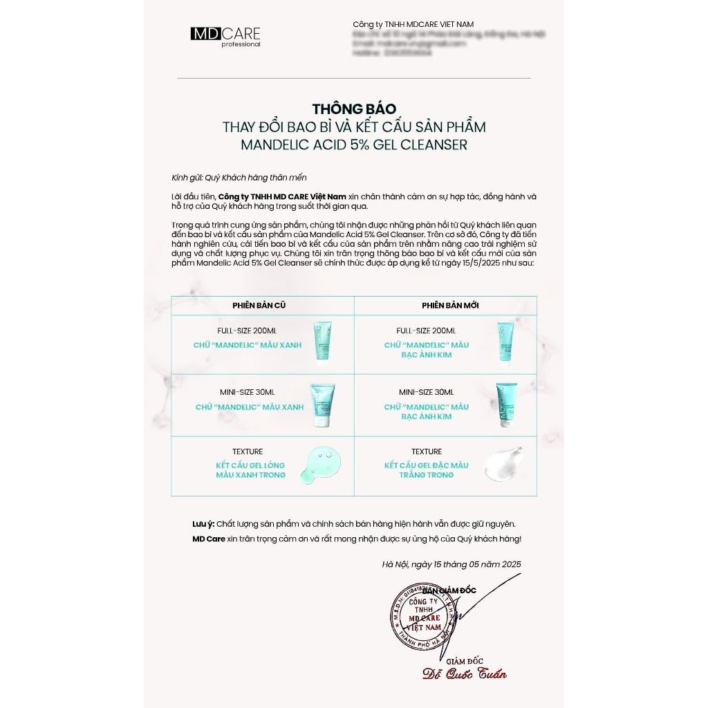 Sữa rửa mặt dạng gel sạch sâu và tẩy tế bào chết nhẹ nhàng MD CARE Mandelic Acid 5% Gel Cleanser 200ml