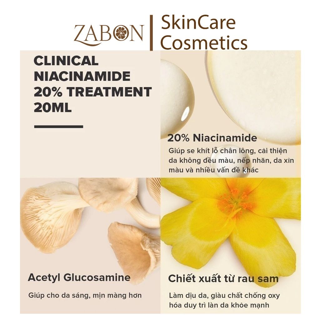 Tinh chất Clinical Niacinamide 20% Treatment chứa nồng độ 20% niacinamide (vitamin B3) đậm đặc có tác dụng làm se khít và giảm thiểu lỗ chân lông mở rộng, khắc phục bề mặt da kém mềm mịn tuổi tác hoặc do ánh nắng mặt trời gây ra.